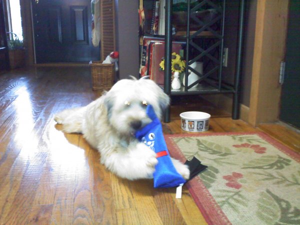Mardy chewing on his Christmas toy